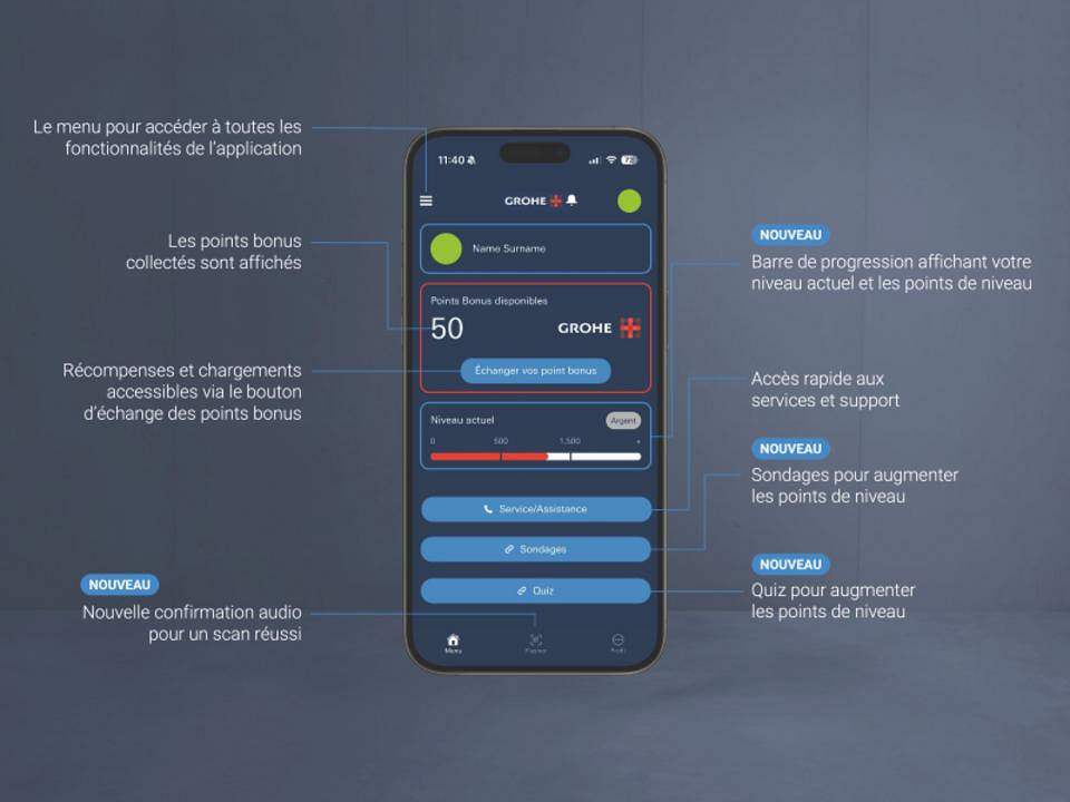 GROHE+ est un programme de fidélité gratuit, conçu exclusivement pour les installateurs professionnels. Téléchargez l’application GROHE+ et faites-en un atout majeur de votre boîte à outils. Avec l’application GROHE+, vous bénéficiez d’un accès rapide aux réponses à vos questions, à des experts techniques et à des formations produits pour rester toujours à jour.